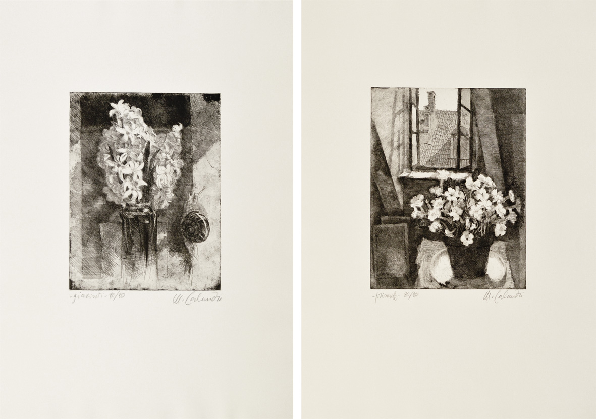 CALANDRI MARIO Torino 1914 - 1993 Giacinti 1984 - Primule 1986 lotto di 2 acqueforti es. 80/80 32x24(lastra) 70x50(foglio) firma in basso a destra tiratura in basso a sinistra "Mario Calandri" presentazione di Leonardo Sciascia Edizioni Grafica Internazionale Torino 1988