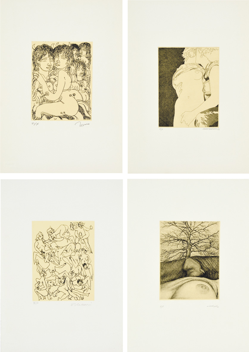 AUTORI VARI Sull' erotismo.....1979 cartella contenente 4 acqueforti su carta cina es. VI/X 16x12(lastra) 25x35(foglio) firma in basso a destra tiratura in basso a sinistra Mino Maccari, Attilio Steffanoni, Peter Willburger, Tono Zancanaro a cura di Mario Stefani stamperia il Salone Padova