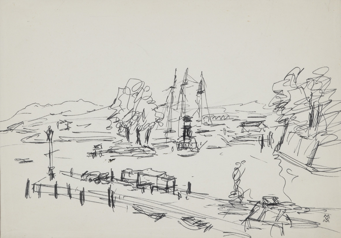 VELLANI MARCHI MARIO Modena 1895 - Milano 1973 Paesaggio disegno a china su carta 30x40 siglato in basso a destra
