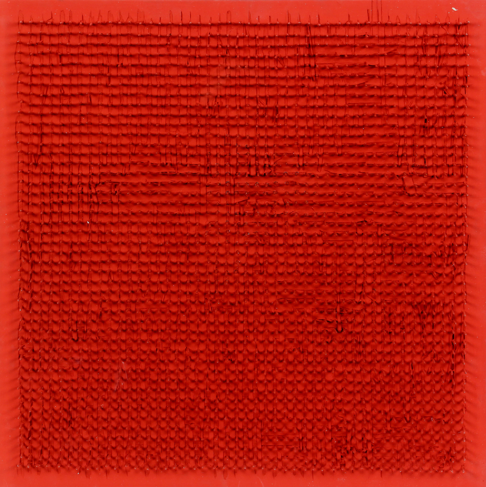 Bernard Aubertin, Tableau clous, 1968, acrilico e chiodi su tavola, cm. 50x50, firmato e datato al retro, certificato di autenticità dell'artista su fotografia, certificato di archiviazione dell'Archivio Opere Bernard Aubertin di Brescia su fotografia, certificato di provenienza della D.G. Arte Casa d'Arte di Treviso/Padova; certificato di archiviazione dell'Archivio Aubertin