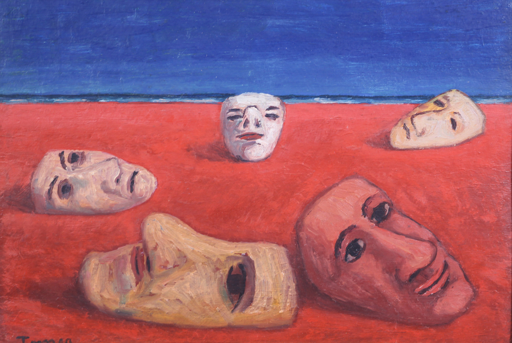 Fiorenzo Tomea, Maschere, olio su cartone, cm. 30,5x40,5, firmato in basso a sinistra, firmato e intitolato al retro, certificato di autenticità su fotografia