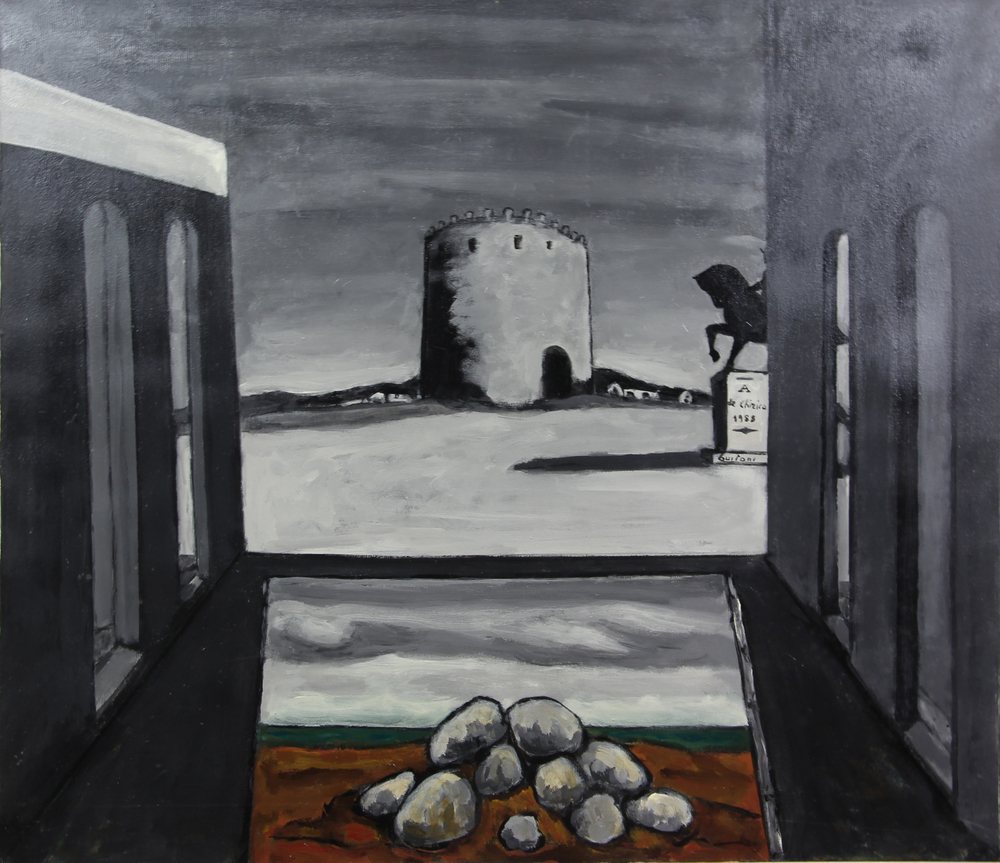 Piero Buitoni, Omaggio a De Chirico, 1988, olio su tela, cm. 80x90, firmato, intitolato e datato al centro e al retro, certificato di autenticità su fotografia