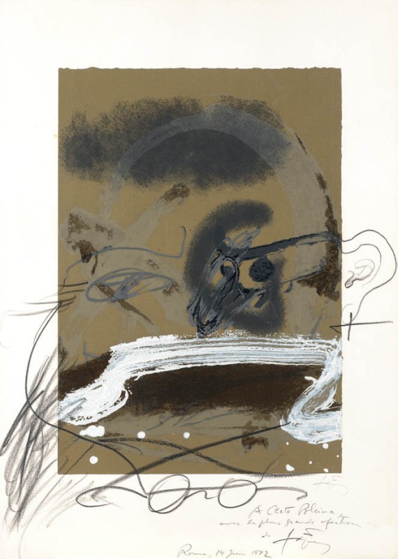 Antoni Tàpies Barcellona 1923 - 2012 Senza titolo, 1982 Acquaforte ritoccata a mano, cm. 70x50 Firma a matita sul margine in basso a destra: Tàpies, tiratura in basso a sinistra: E.A.: dedica, firma e data in basso a destra: A Cleto Polcina / avec la plus grande afection / de / Tàpies / Roma, 14 Juin 1982: timbro a secco Il Bulino. Storia: Collezione Cleto Polcina, Roma; Collezione privata