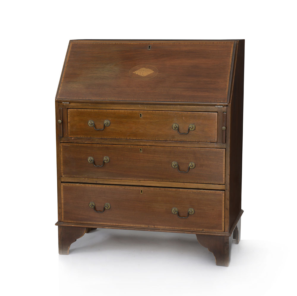 CASSETTONE CON RIBALTA IN MOGANO, INGHILTERRA, XX SECOLO, fronte a tre cassetti e calatoia; sbeccature e usure.