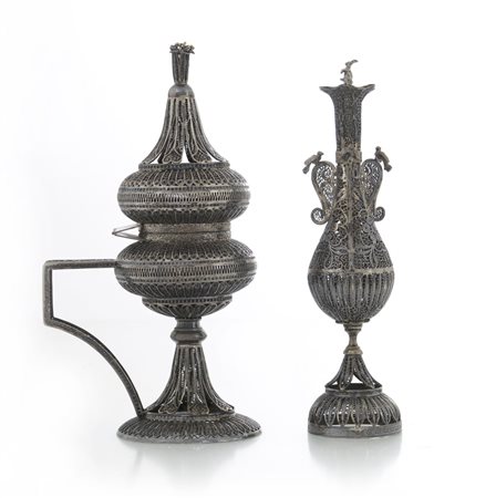 ARGENTI D'EPOCA UNA LUCERNA E UN VASO CON COPERCHIO IN FILIGRANA D'ARGENTO,...