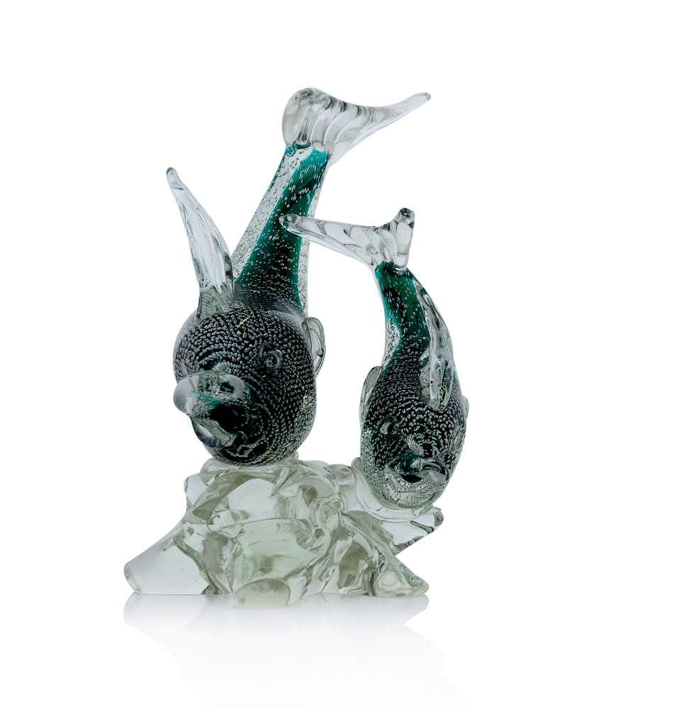 DUE PESCI IN VETRO A STRATI, A.SEGUSO, MURANO, ANNI '40, soffiato con strato verde sommerso e bullicanti; difetto.