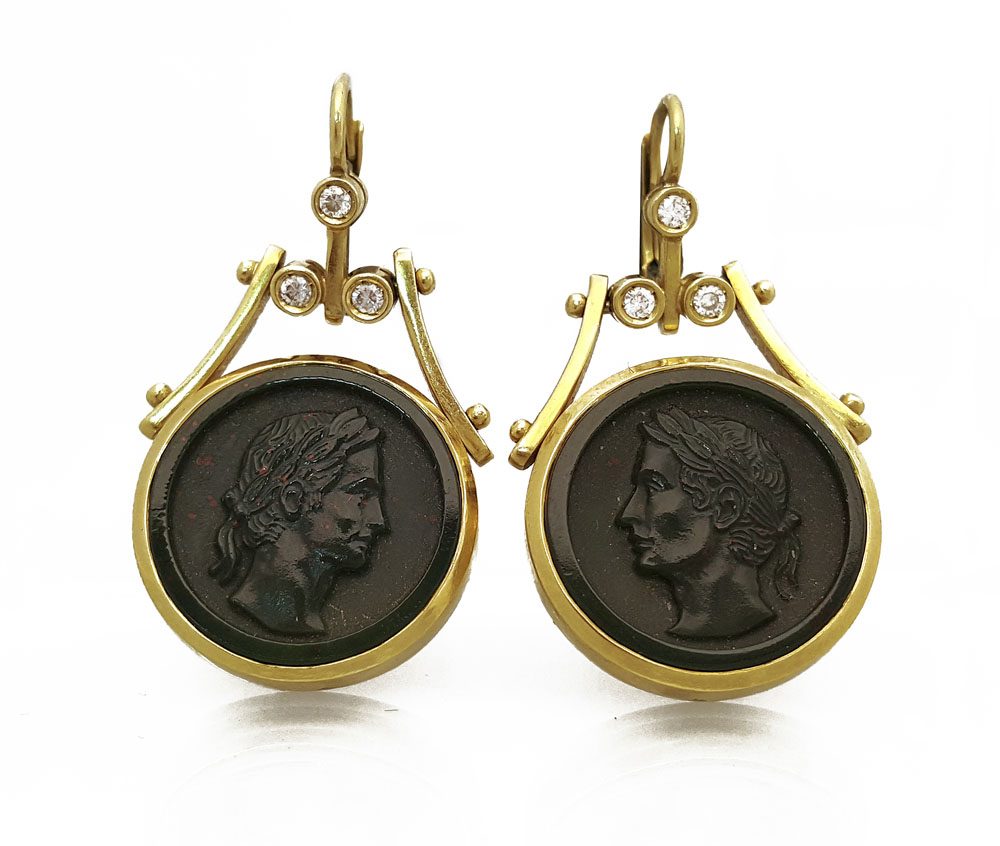 COPPIA DI ORECCHINI PENDENTI. In oro giallo 18 kt a monachella e clip con inserti circolari in diaspro sanguigno incisi a profili maschili ed impreziositi da settori a tre diamanti taglio brillante per tot. cts. 0,20 ca.