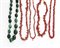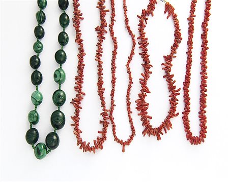 LOTTO DI CINQUE COLLANE. Una ad un filo di grandi sfere in malachite (visibili piccole mancanze di materiale) e quattro interamente in rametti di corallo con chiusure in metallo decorate da gemme sintetiche.