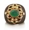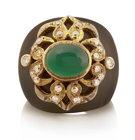 ANELLO. In ebano con settore applicato a volute in argento decorate da gemme incolore taglio brillante (ad imitazione del diamante), al centro gemma verde taglio ovale cabochon (prob. crisoprasio).