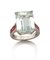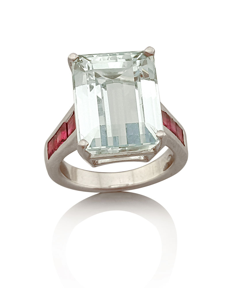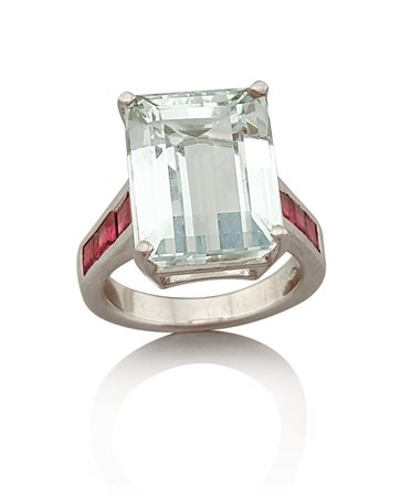 ANELLO. In oro bianco 18 kt montatura satinata centrata da acquamarina taglio smeraldo di cts. 10,50 ca. entro decori laterali in rubini taglio carrè incastonati a binario per tot. cts. 0,75 ca.