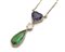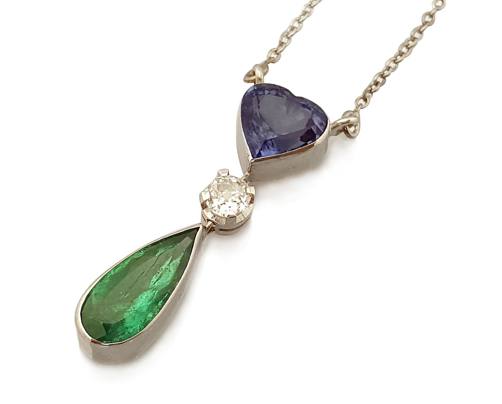 CIONDOLO. In oro bianco 18 kt a tre settori verticali incernierati impreziositi da zaffiro taglio cuore di cts. 3,70 ca., diamante taglio vecchio di cts. 0,45 ca. e smeraldo Zambia taglio goccia di cts. 2,60 ca., trattenuto da fine catenina in oro bianco 18 kt.