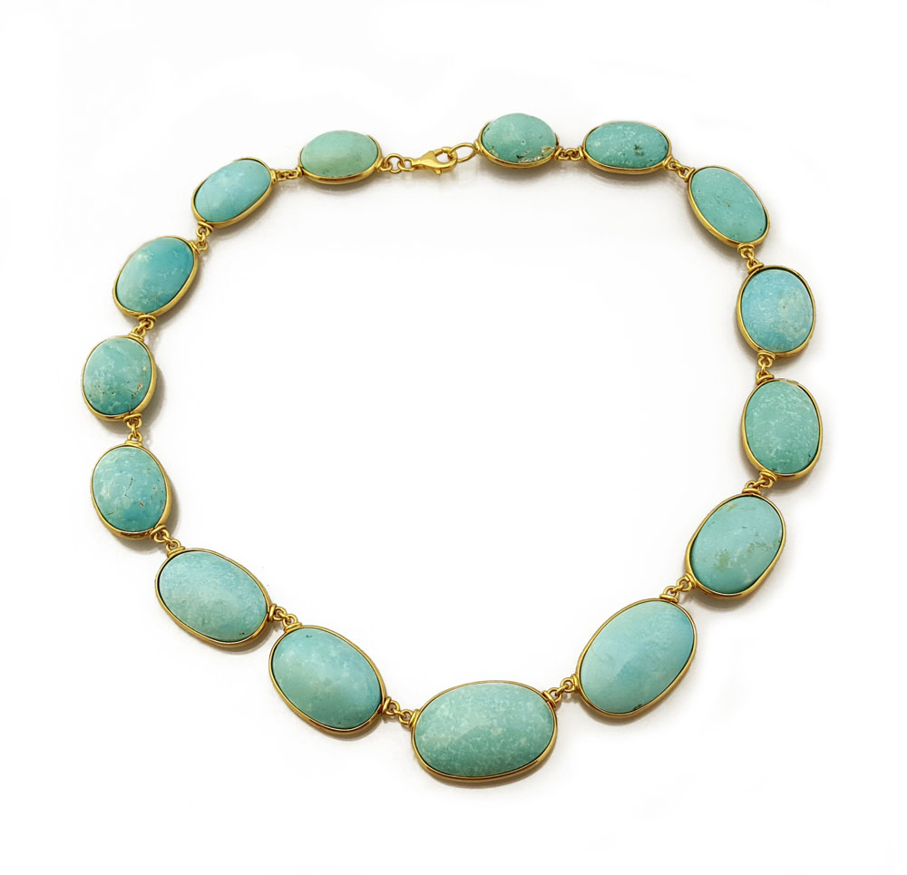 COLLANA. In oro giallo 18 kt realizzata a motivi ovali disposti in gradazione dal centro trattenenti turchesi taglio ovale cabochon entro castoni sagomati e ribattuti.