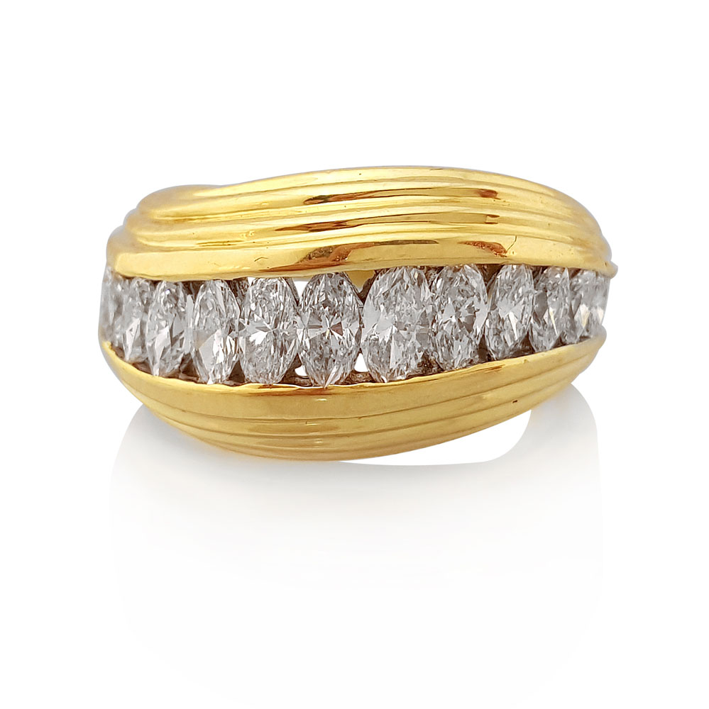 ANELLO. In oro giallo 18 kt montatura mossa e gradinata con al centro tredici diamanti taglio navette disposti a rivière per tot. cts. 1,00 ca. incastonati a binario.