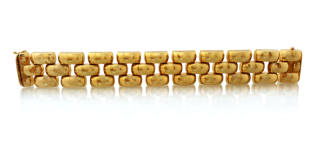 BRACCIALE ANNI '40 CA. In oro giallo 18 kt a maglie rettangolari bombate ed incernierate in oro scatolato, reca firma Cartier apocrifa.