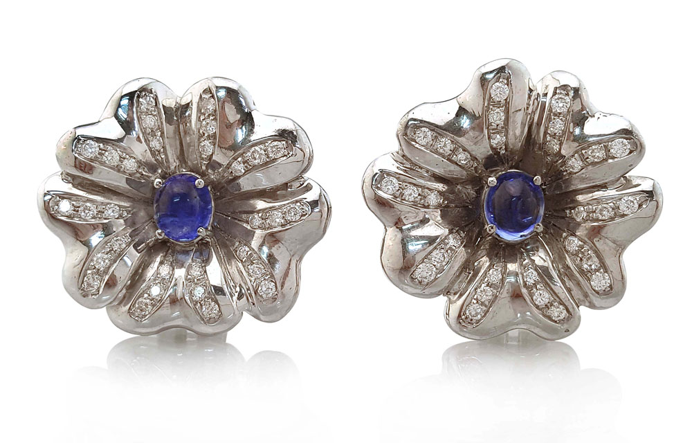 COPPIA DI ORECCHINI. In oro bianco 18 kt perno e clip realizzati a fiore con zaffiri taglio ovale cabochon per tot. cts. 1,60 ca. entro decori in diamanti taglio brillante per tot. cts. 1,20 ca.