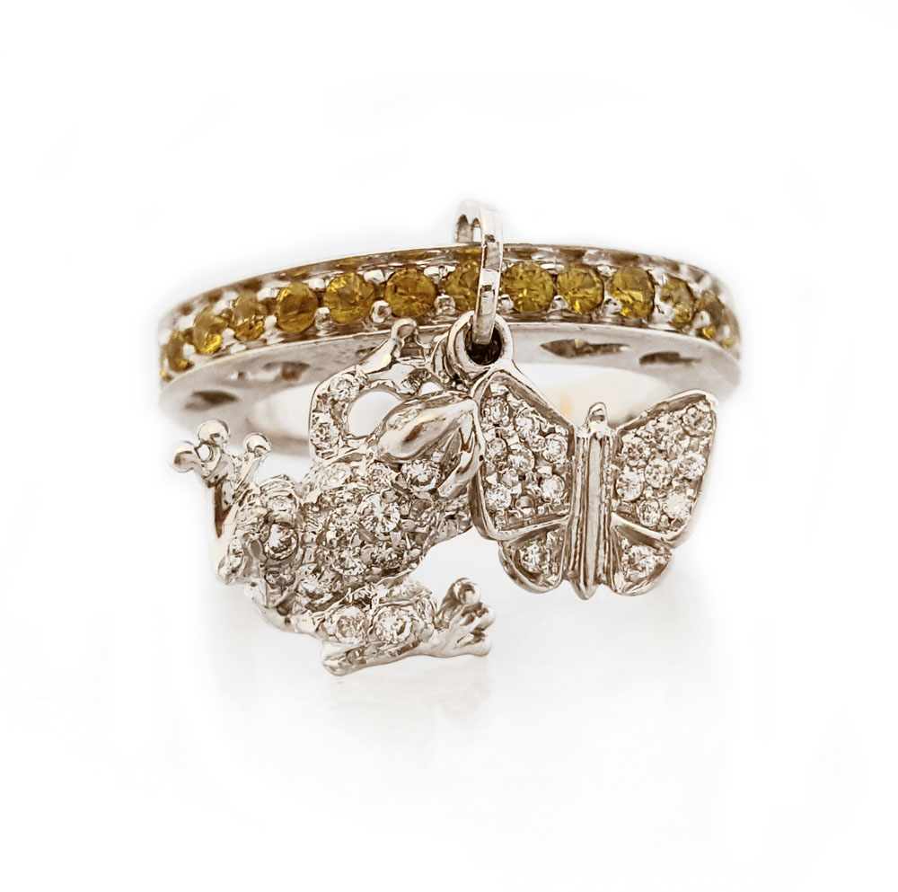 ANELLO. In oro bianco 18 kt con topazi gialli taglio rotondo disposti a rivière per tot. cts. 0,60 ca. impreziosito da due charms raffiguranti ranocchia e farfalla in diamanti taglio brillante per tot. cts. 0,20 ca.