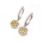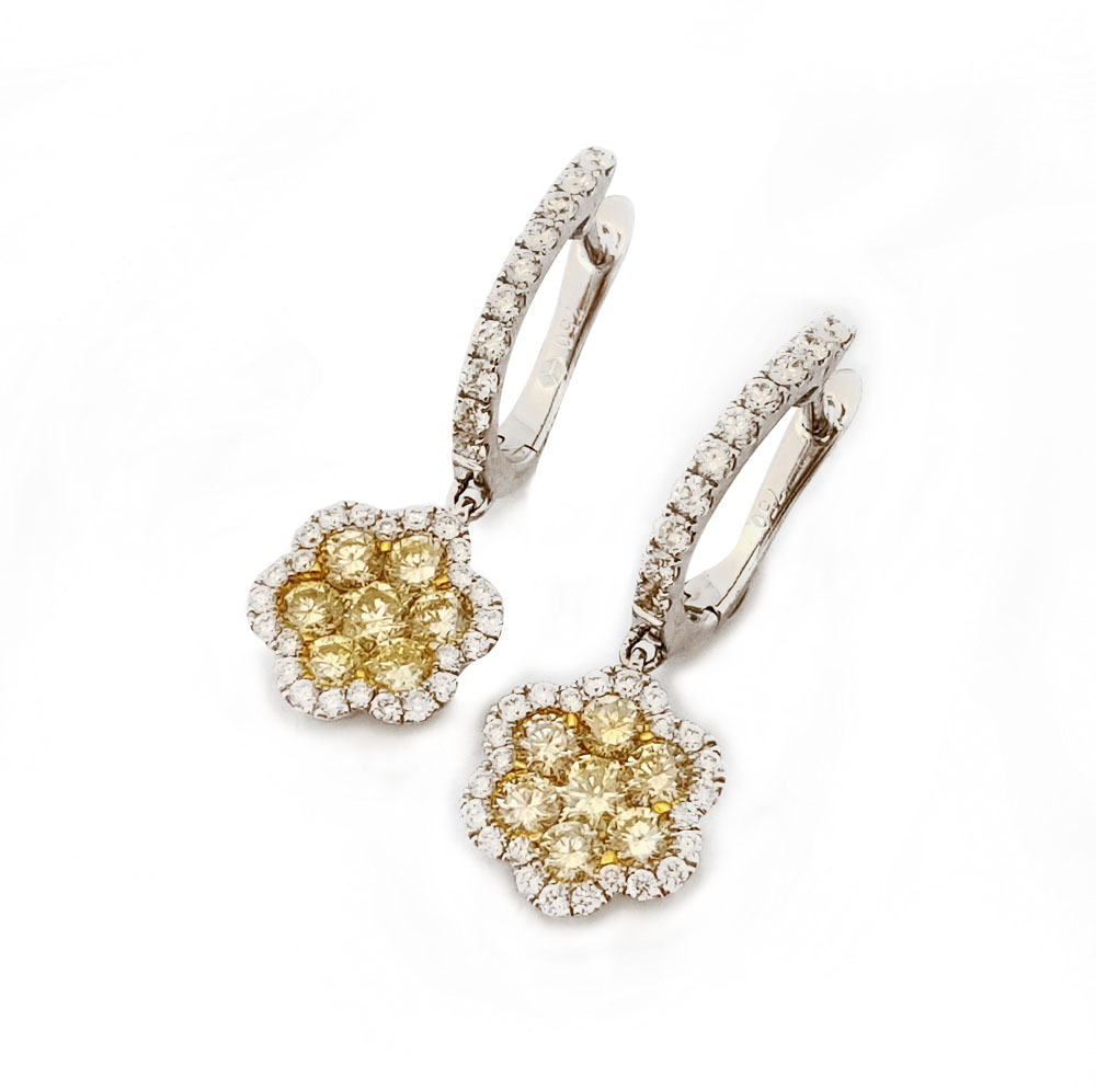 COPPIA DI ORECCHINI PENDENTI. In oro bianco 18 kt perno e clip, realizzati a settori verticali con motivi oscillanti a fiore nella parte terminale, diamanti taglio brillante incolore e yellow per tot. cts. 1,60 ca.