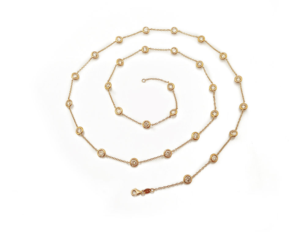 COLLANA. In oro rosa 18 kt ad un lungo filo di maglie ad anelli ovalizzati con interruttori in diamanti taglio brillante per tot. cts. 9,10 ca. entro castoni tondi ribattuti.