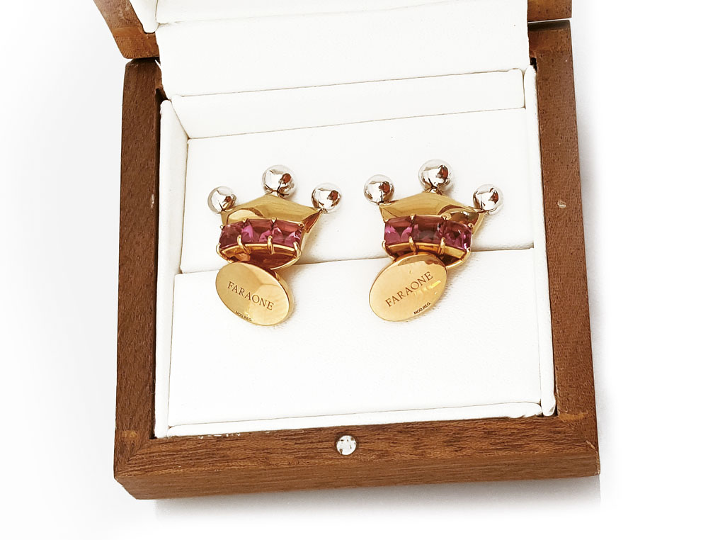 COPPIA DI POLSINI DI FARAONE. In oro bianco e rosa 18 kt realizzati a coroncine impreziosite da tormaline taglio carrè cabochon alternate a settori ovalizzati con logo della maison inciso, entro astuccio originale.