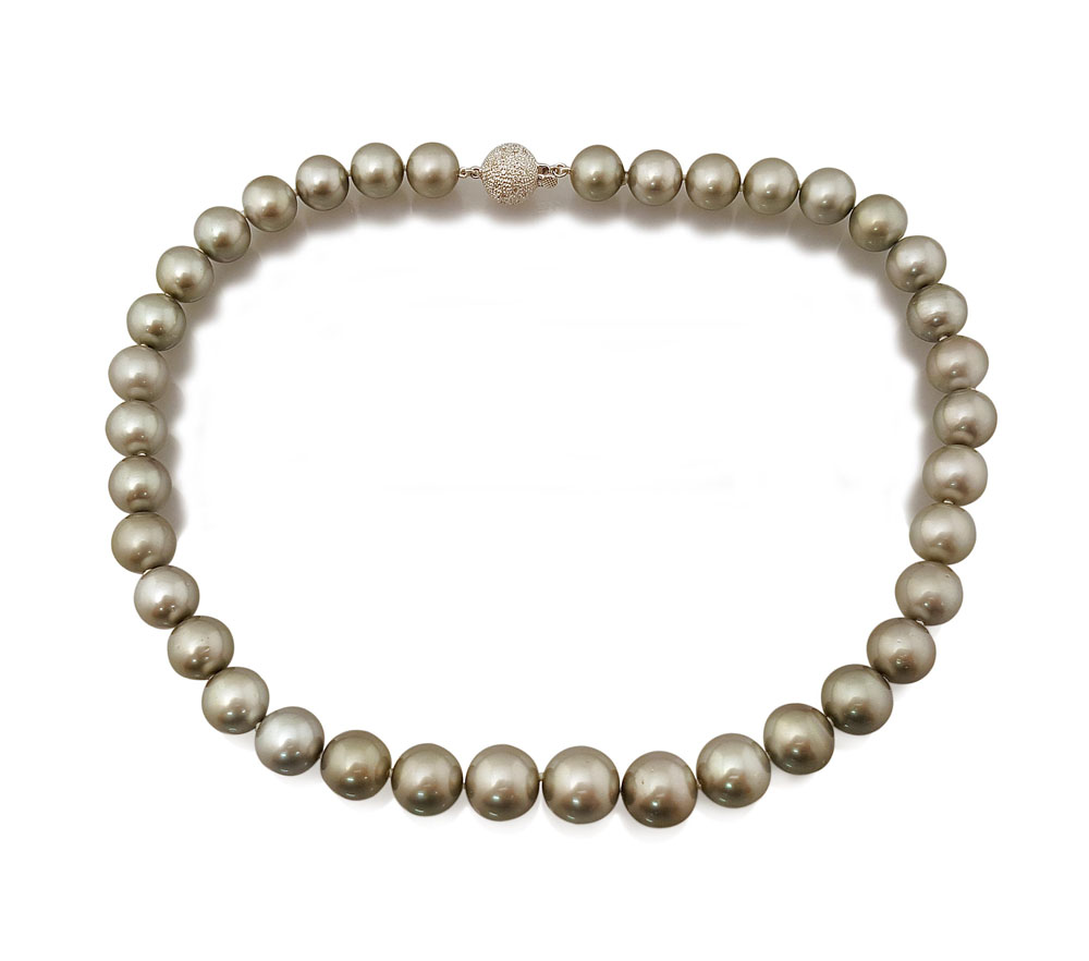 COLLANA. Ad un filo di perle coltivate Tahiti silver disposte in gradazione dal centro di mm 13/11 ca. con chiusura sferica in oro bianco 14 kt decorata da piccoli diamanti taglio brillante.