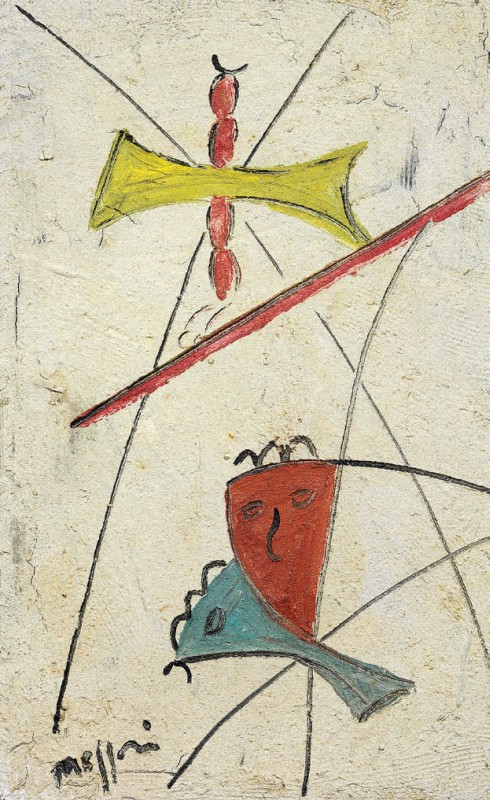 Piero Maggioni Monticello Brianza (Co) 1931 - Viganò (Lc) 1995 Due entità, 1971 Tecnica mista su tavola, cm. 70x43 Firma in basso a sinistra: Maggioni. Certificato su foto Archivio Piero Maggioni, con n. 148P96.