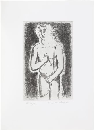 CARRA' CARLO (1881 - 1966) Uomo con bicchiere. Acquaforte. Cm 35,00 x 50,00. 34/60. Firma in lastra. Tiratura e titolo in basso a matita. Dimensione lastra: 30 x19 cm. Al retro timbro e firma a cura di Massimo Carrà. Timbro a secco Studio Carrà, Milano.