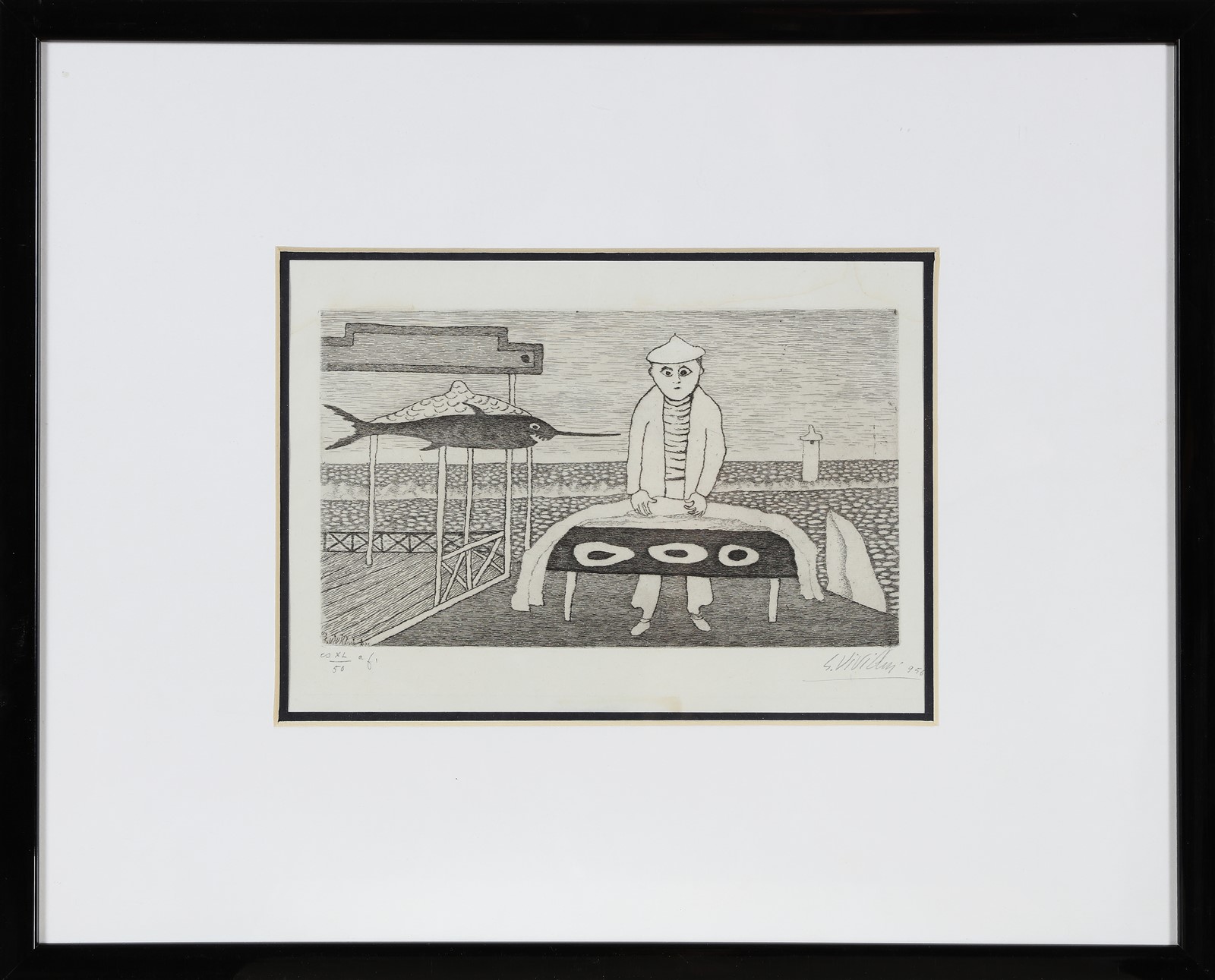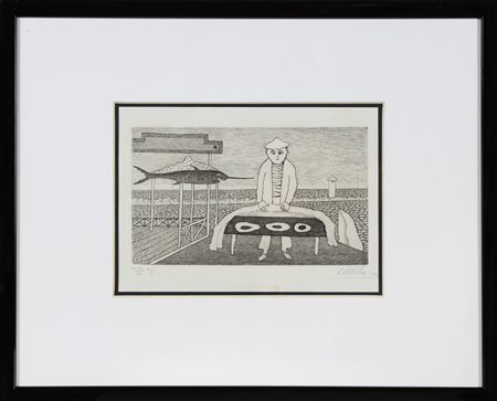 VIVIANI GIUSEPPE (1898 - 1965) Venditore e pesce. 1956. Acquaforte. Cm 27,50 x 20,00. Esemplare XL. Tiratura, firma e anno a matita in basso. Pubblicazione: Chiara Tav. 89 - Marino Tav. 103. Cornice presente
