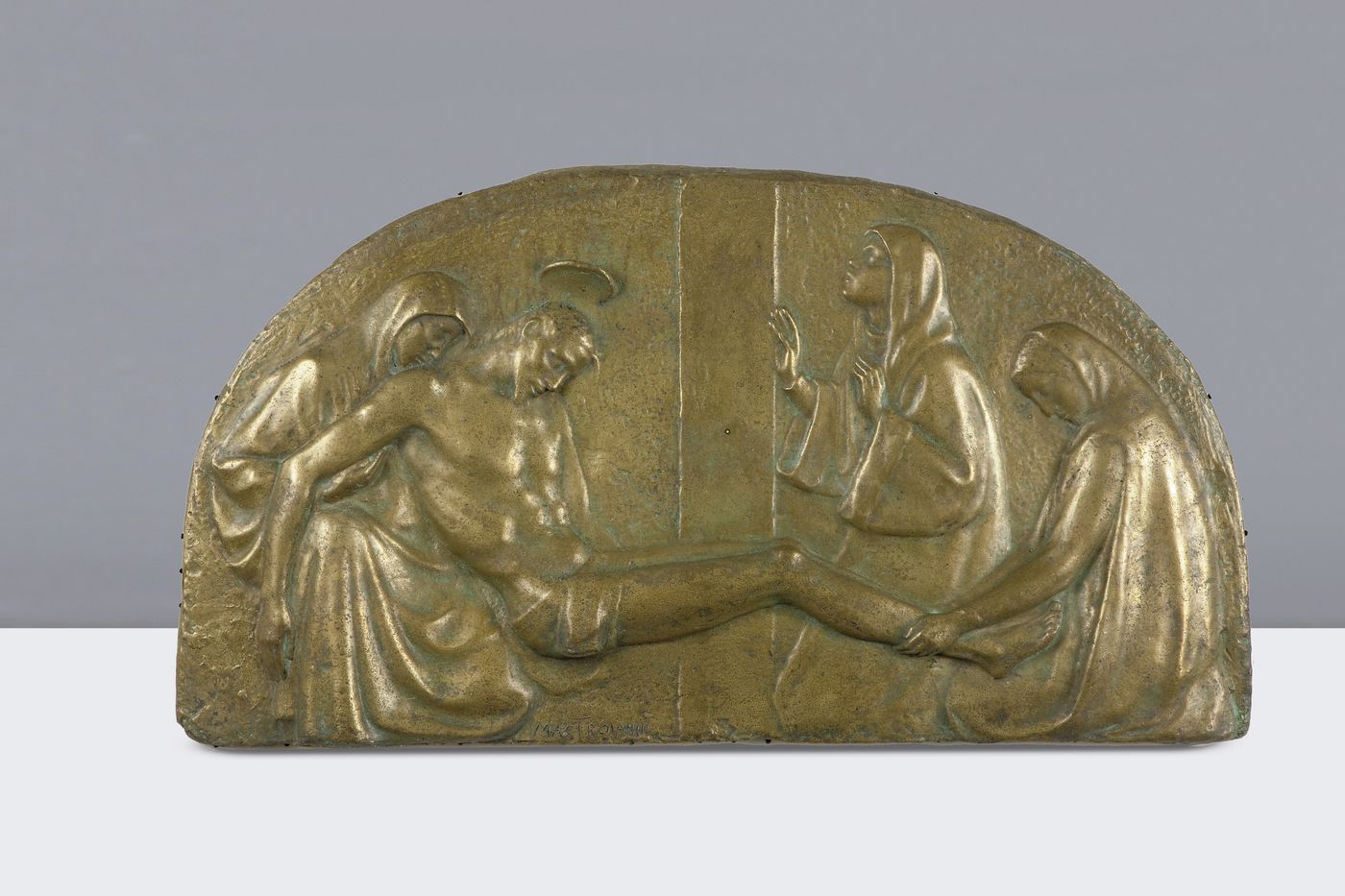 MASTROIANNI UMBERTO (Fontana Liri (FR) 1910 - 1998 Marino (Roma)) - "Deposizione" 1928, 78x43 scultura in bronzo. Opera firmata in basso al centro. Il bassorilievo ripropone lo stesso soggetto del paliotto conservato presso la chiesa di Santa Maria degli Angeli in Roma. Autentica dell'artista su fotografia. Parere verbale favorevole del Prof. De Santi