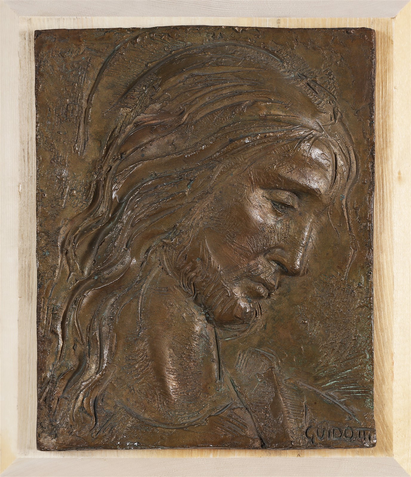 GUIDOTTI FERRUCCIO (1931 - 2012) Volto di Cristo. Bassorilievo in bronzo. Cm 25,00 x 30,00 x 4,00. Dimensioni prese con il supporto ligneo. Firma in basso a destra.