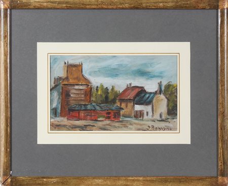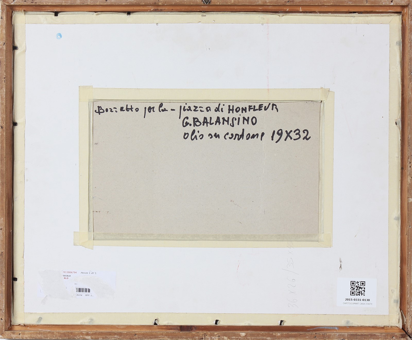 BALANSINO GIOVANNI (1912 - 1986) Bozzetto per la piazza di Honfleur. Olio su cartone. Cm 32,00 x 19,00. Firmaa in basso a destra. Al retro titolo e firma. Cornice presente