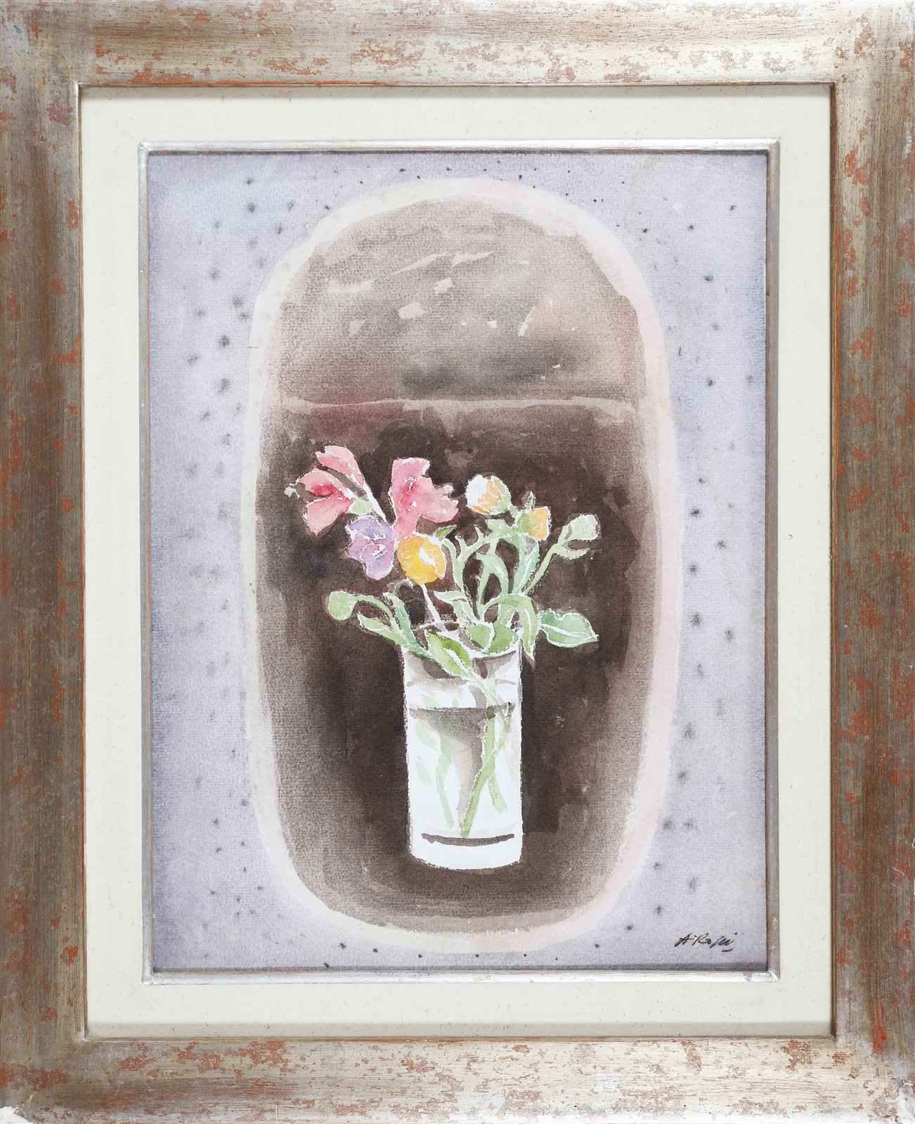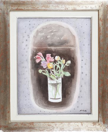 ROSSI ATTILIO (1909 - 1994) Vaso di fiori. Tempera su carta su tela. Cm 36,00 x 48,00. Firma in basso a destra. Al retro cartiglio descrittivo a cura della Galleria Ferrari, Treviglio. Cornice presente
