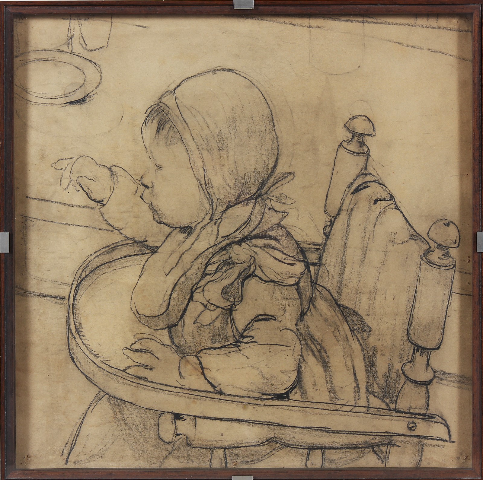 MUSITELLI GIULIO VITO (1901 - 1990) Infante. Carboncino su carta incollata su tela.. Cm 40,00 x 40,00. Al retro cartiglio Galleria D' Arte Pirra, Torino. Cornice presente