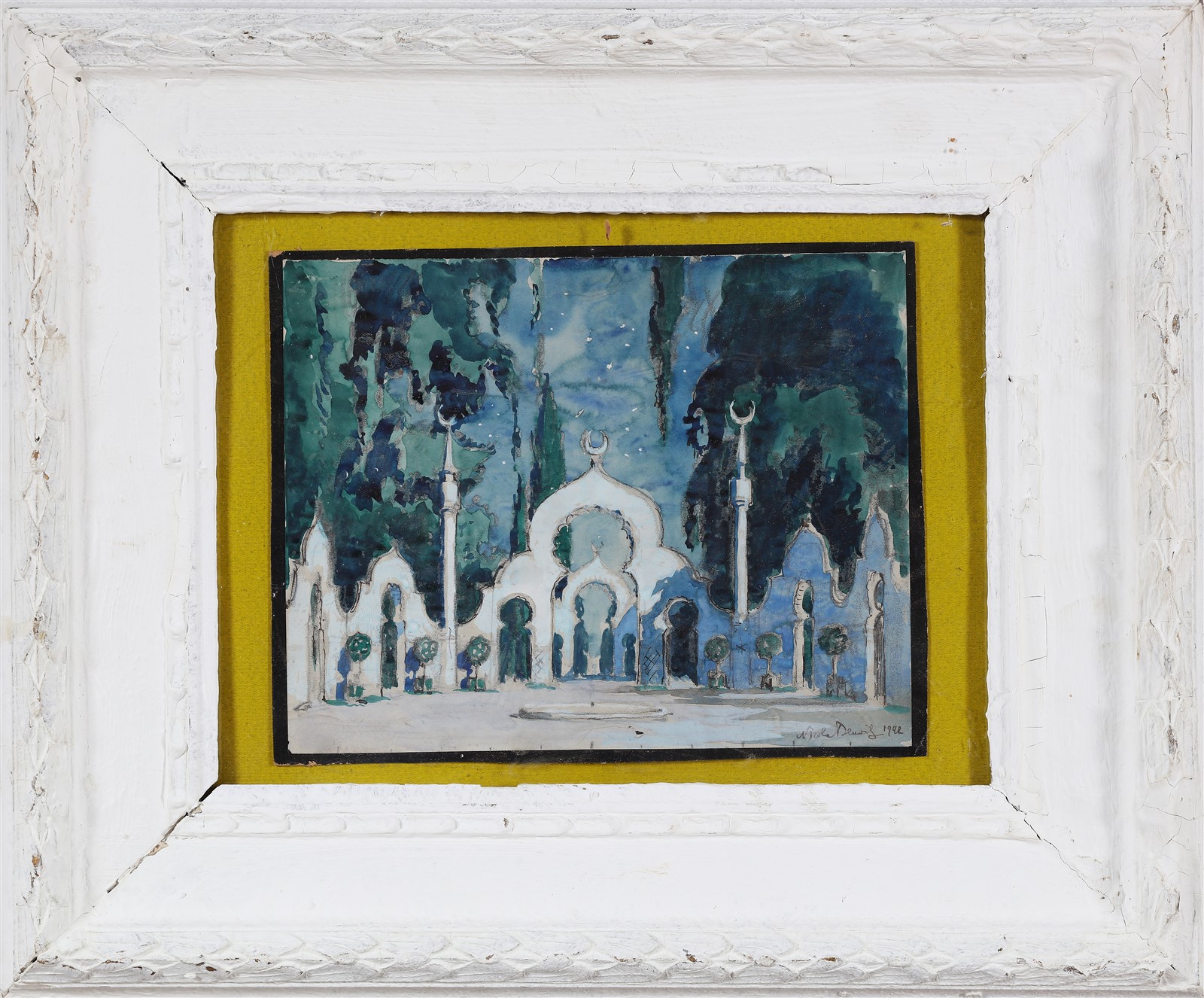 BENOIS NIKOLAJ ALEKSANDROVIC (1901 - 1988) Scena teatrale. 1942. Acquerello su carta applicato su cartoncino. Cm 31,00 x 23,50. Firma e anno in basso a destra. Cornice presente