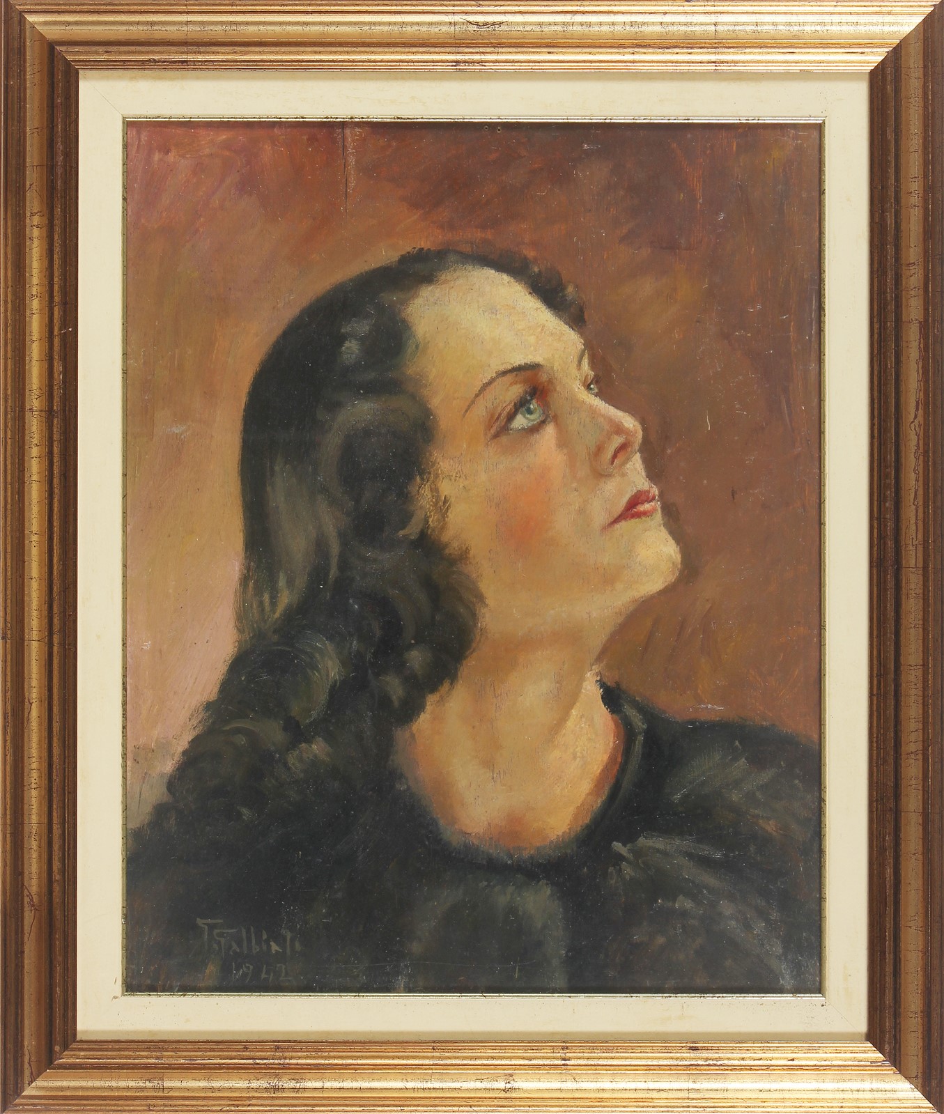 GALBIATI GIACINTO (1908 - 1992) Volto femminile. 1942. Olio su tavola. Cm 40,00 x 50,00. Firma e anno in basso a sinistra.