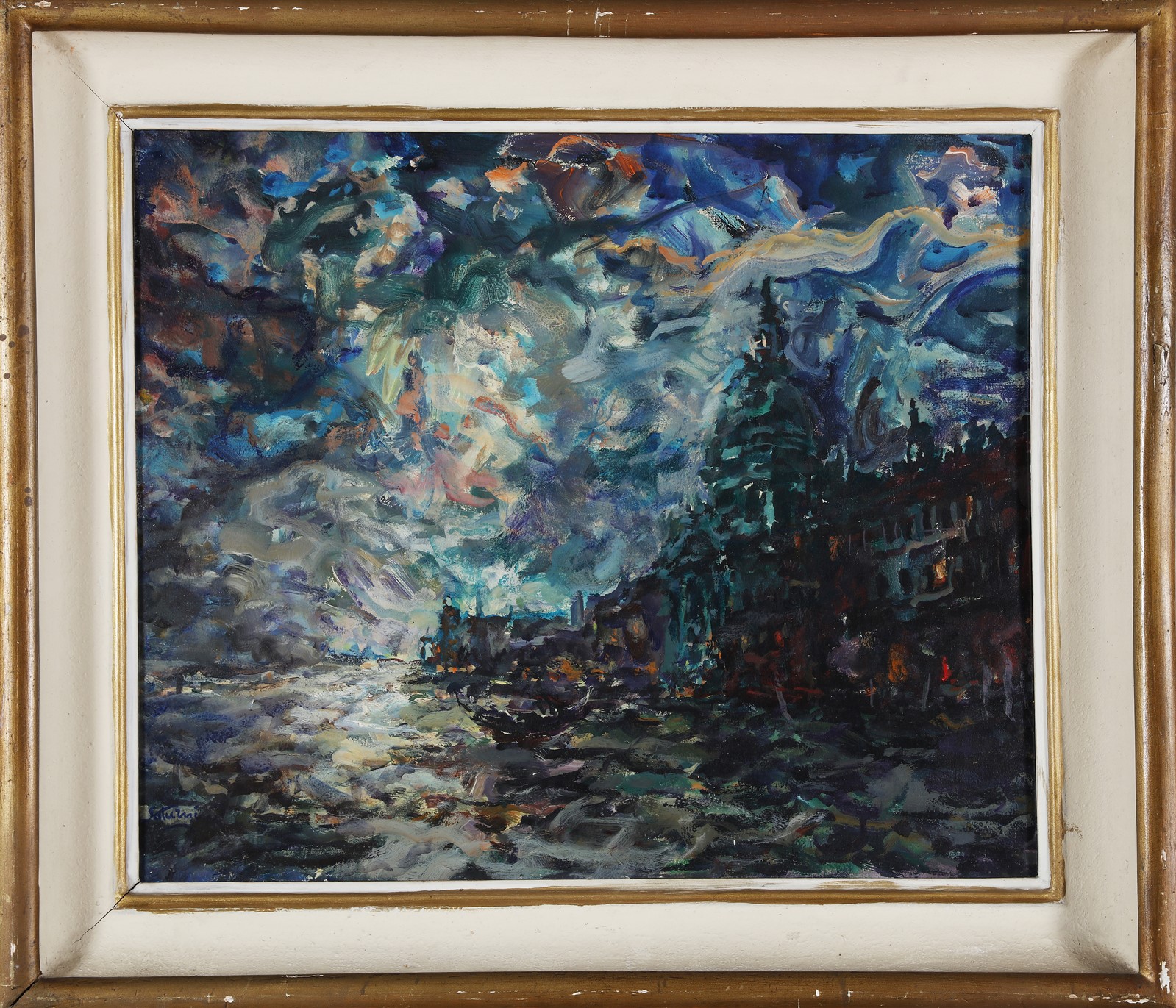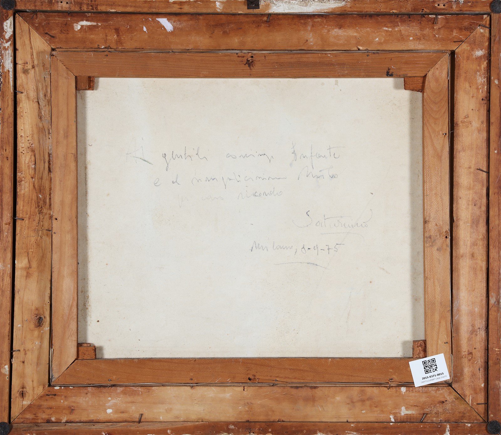SATURNINO Senza titolo. Olio su tela . Cm 60,00 x 50,00. Al retro dedica con firma datata 1975. Cornice presente