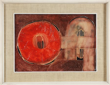 CALCAGNILE Astratto. Olio su masonite. Cm 47,50 x 36,00. Firma in basso a destra. Cornice presente