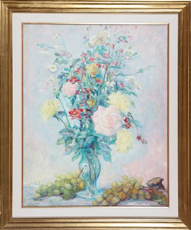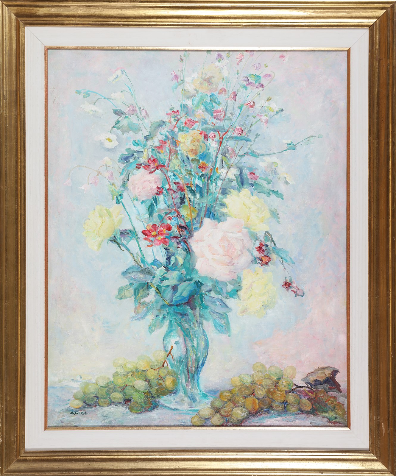FIORAVANTE ARIOLI (1890 - 1980) Rose. Olio su tela. Cm 60,00 x 77,00. Firma in basso a sinistra. Al retro: cartiglio biografico. Cornice presente