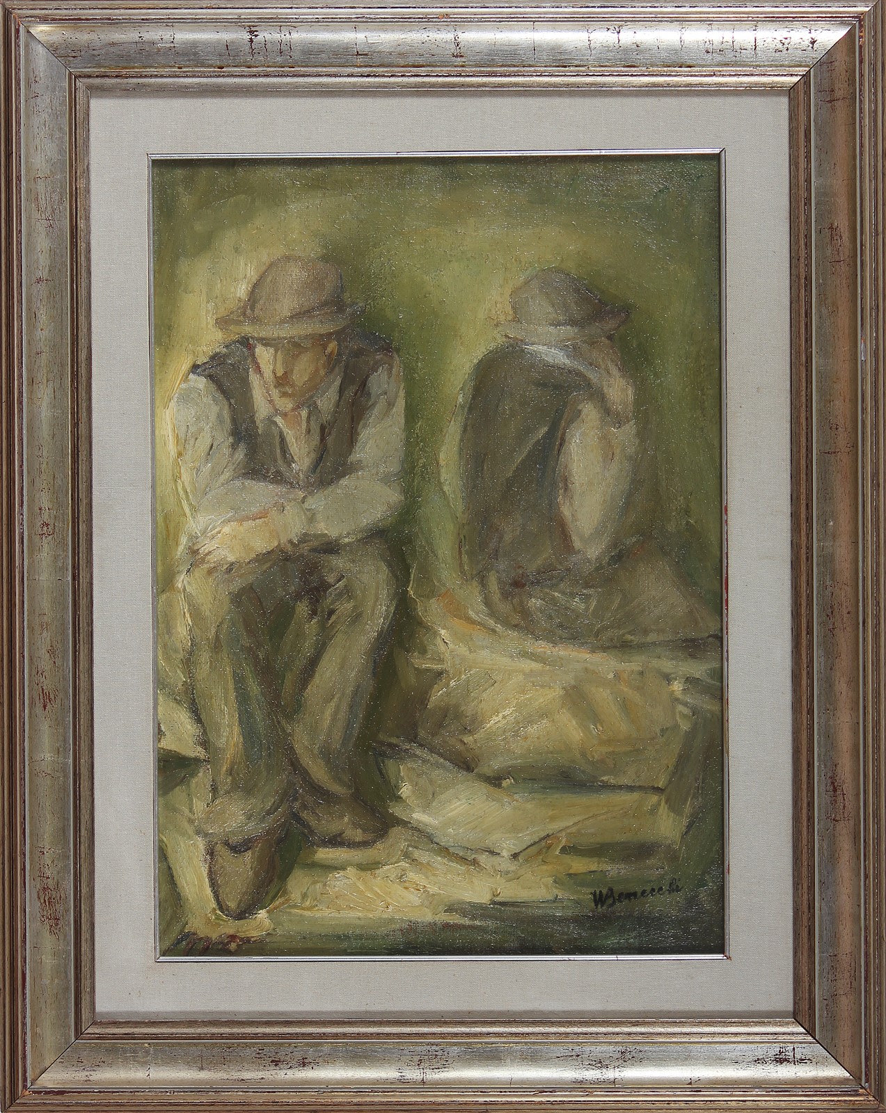 BENECCHI WALTER (n. 1922) Due contadini. Olio su tela . Cm 50,00 x 70,00. Firma in basso a destra.