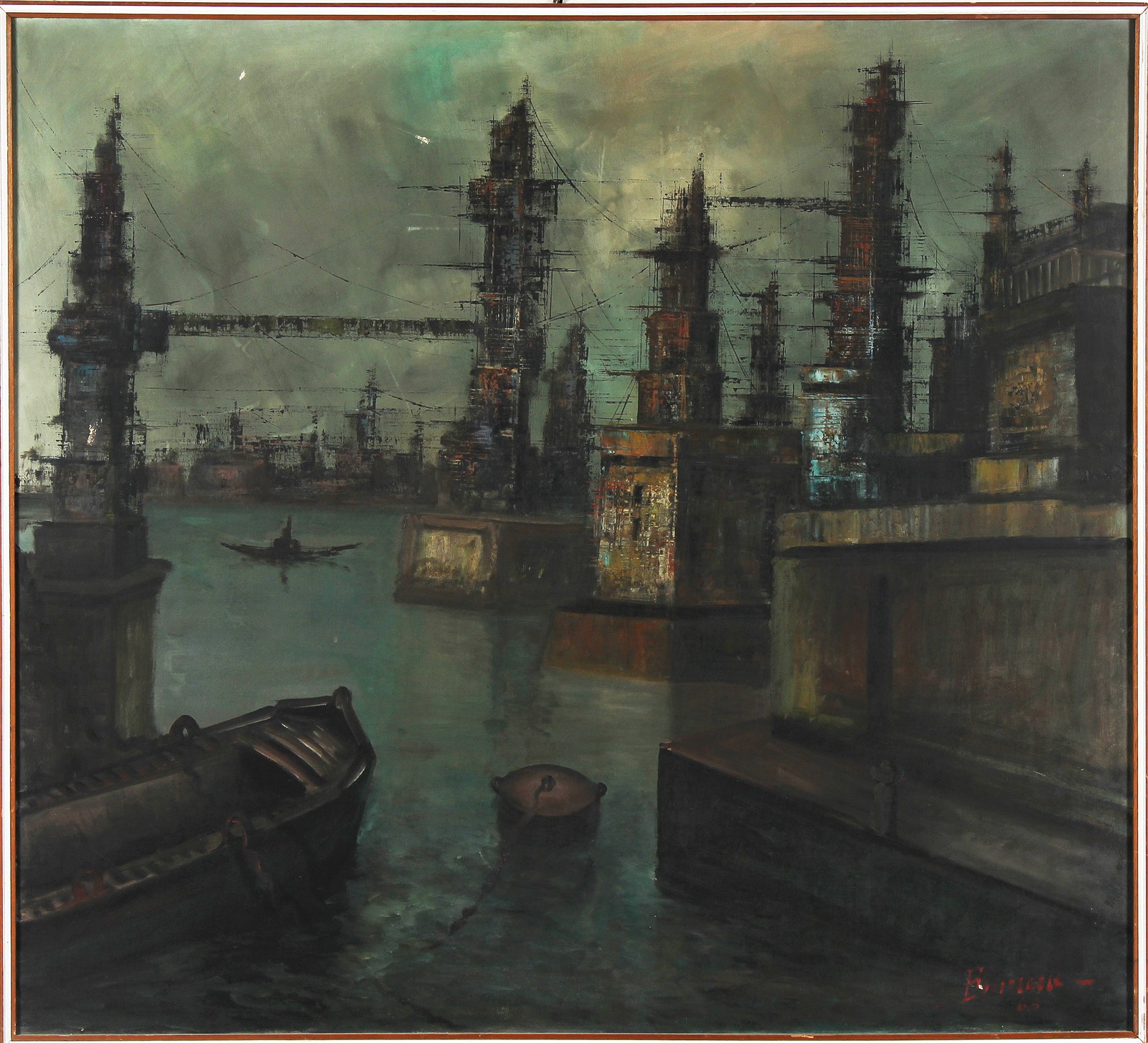 ANONIMO Il porto. Olio su tela . Cm 110,00 x 100,00. Firma e data in basso a destra. Al retro titolo. La tela presenta delle lievi mancanze di colore.