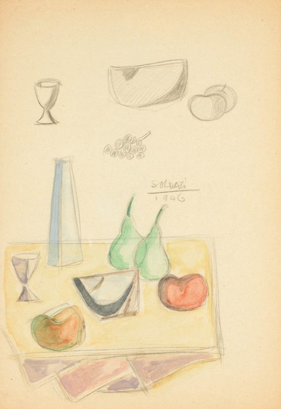 Atanasio Soldati Parma 1896 - 1953 Composizione, 1946 Tecnica mista su carta, cm. 32x21,8 Firma e data al centro: Soldati / 1946. Al verso altra composizione a matita: Senza titolo, 1947: timbro opere inventariate di Atanasio Soldati.