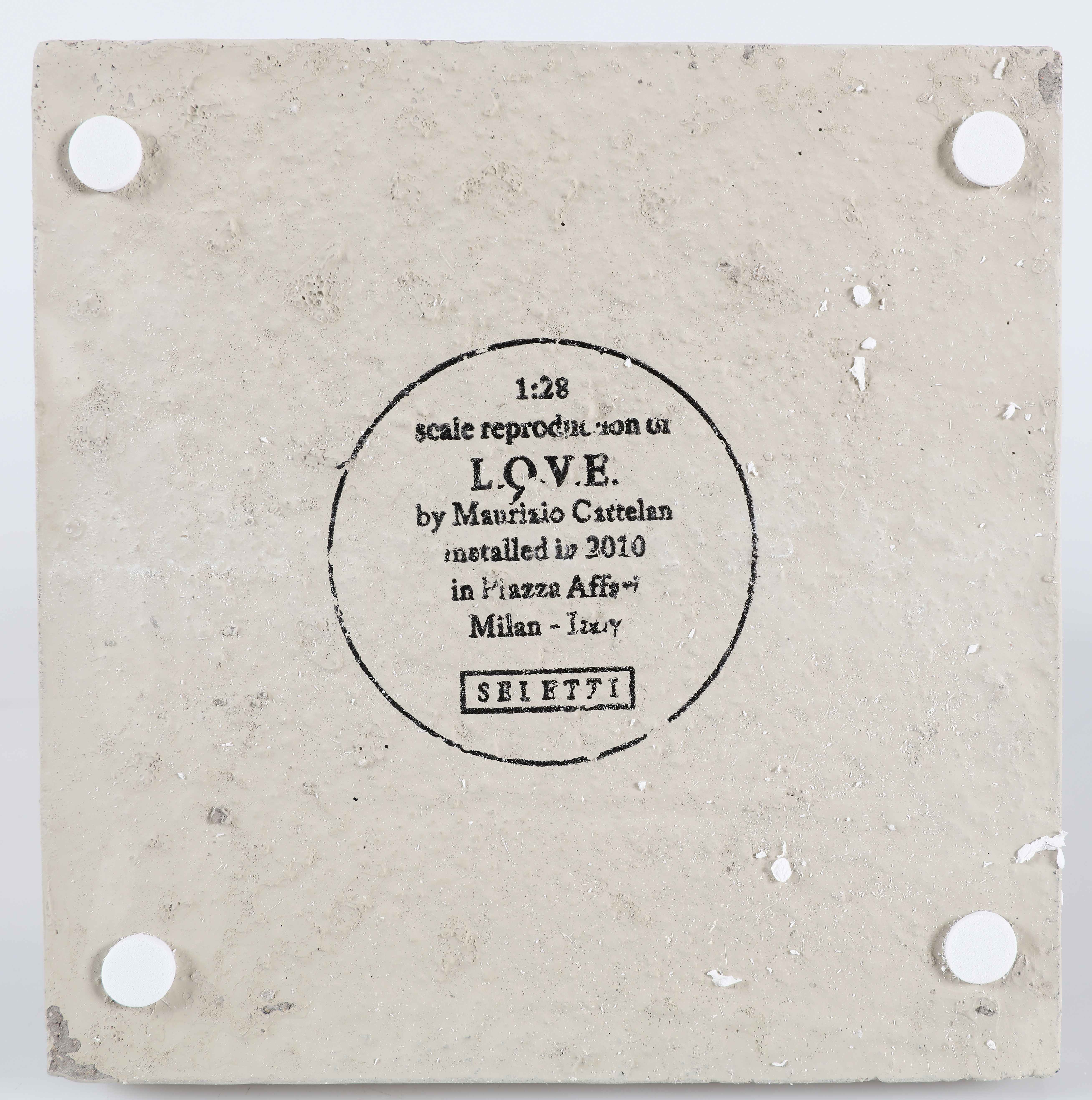 CATTELAN MAURIZIO (n. 1960) L.O.V.E. Multiplo in cemento. Cm 18,00 x 40,00 x 18,00. Riproduzione dell' opera monumetale di Maurizio Cattelan piazza affari. Prodotta da Seletti in 200 esemplari in occasione di Milano design week 2015. Scala 1:28. Cemento. Confezione originale in legno. Venduto in esclusiva dell'evento.