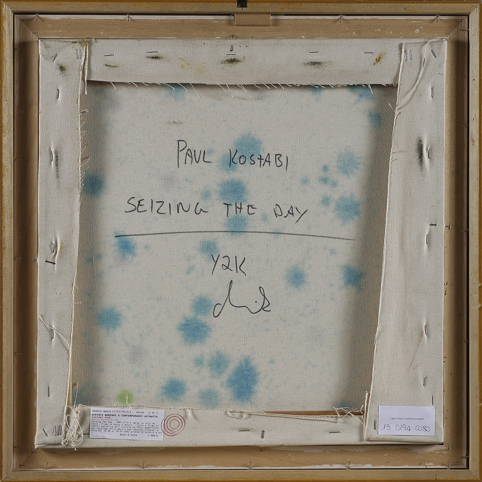 KOSTABI PAUL INDREK (n. 1962) Seizing the day. 2005. Olio e spray su tela. Cm 51,00 x 51,00. Firma in basso a destra. Al retro titolo e firma. Autentica dell'artista su fotografia. Opera pubblicata sul catalogo della mostra Paul Kostabi tenutasi a Pisa dal 16-06 al 20-07 2002 presso la Saletta d'art, come da cartiglio descrittivo al retro.