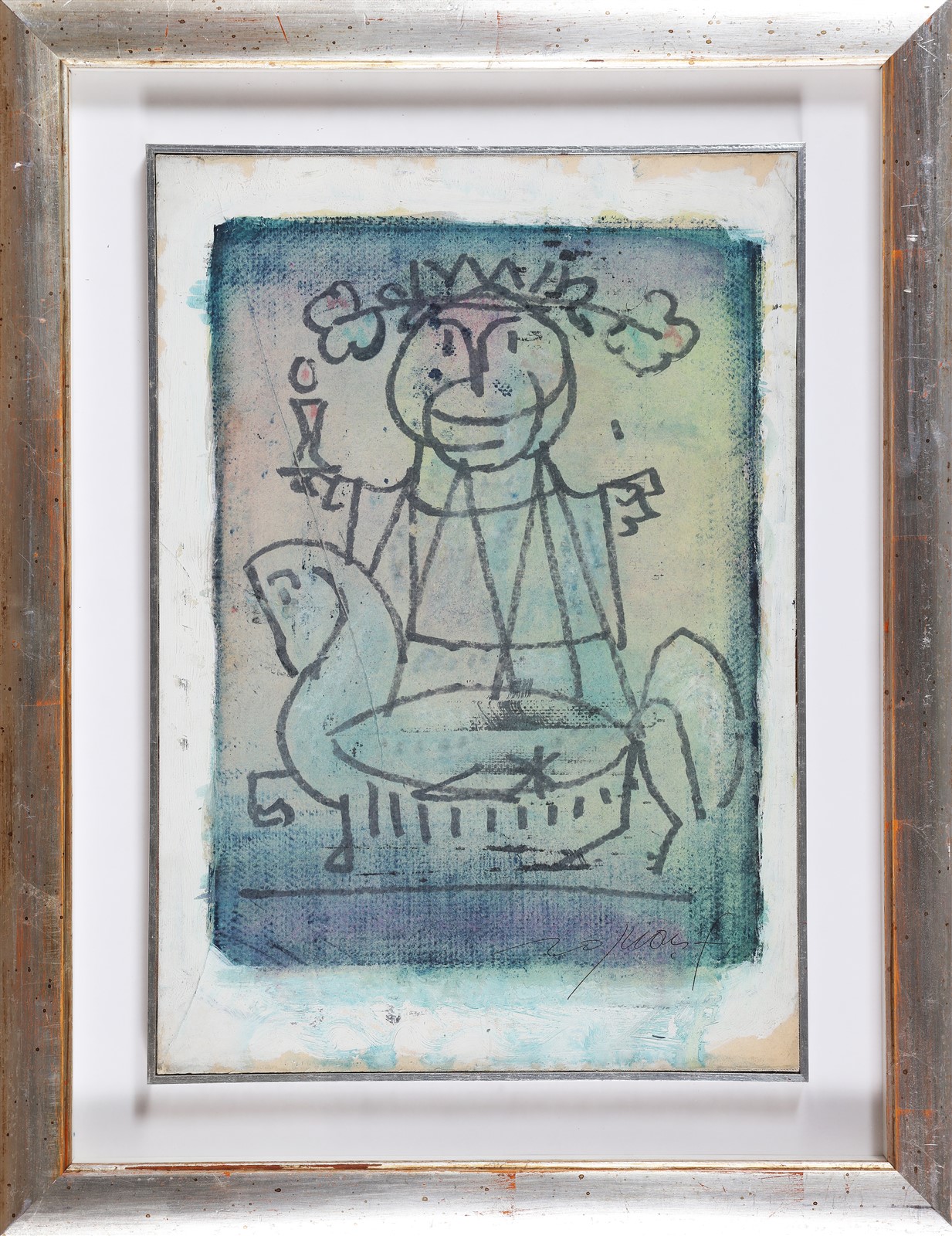 ROGNONI FRANCO (1913 - 1999) Bacco a cavallo. Tecnica mista su carta applicata su tela . Cm 35,00 x 50,00. Firmato in basso a destra. Autentica su fotografia a cura di Mariuccia Noè Rognoni. Cornice presente