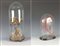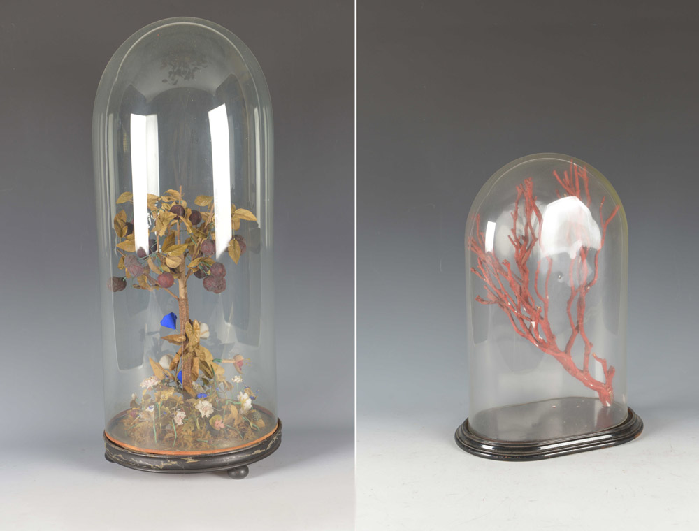 Lotto composto da una composizione con frutta ed un rametto in legno dipinto finto corallo, contenuti in teche di vetro del secolo XIX. Basi in legno ebanizzato (difetti) Lot comprising a fruit composition and an imitation-coral painted branch in 19th-century cases (defects)
