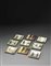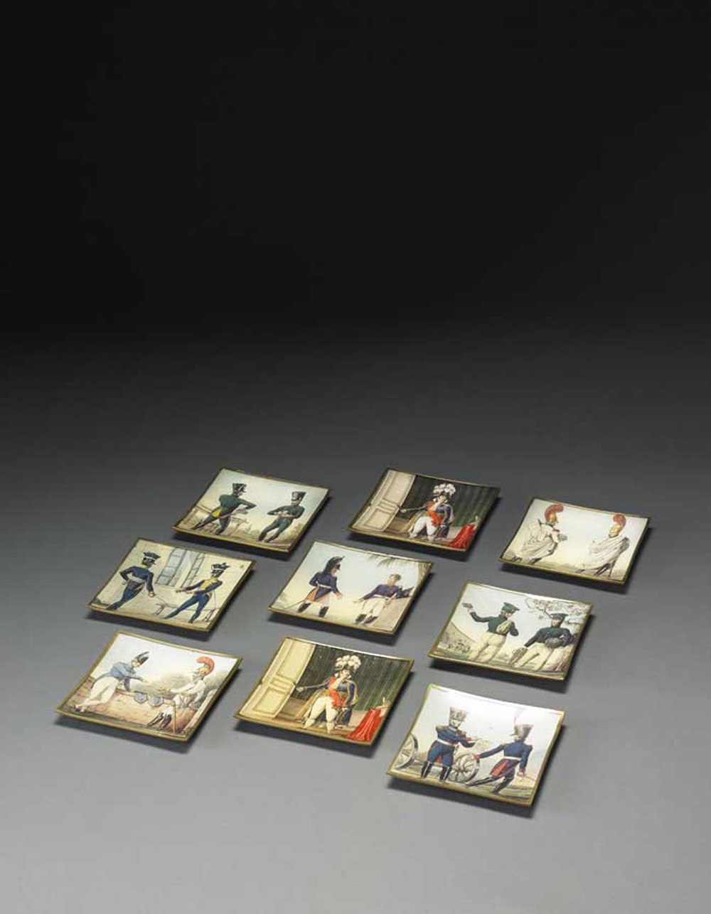 Giulia Maria Michon Pecori gruppo di nove piatti in vetro decorati a mano con stampe dall'antico raffiguranti soggetti militari (cm 15x15) Group of nine hand-decorated glass dishes