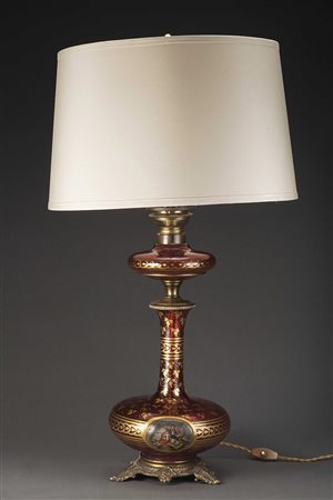 Lampada ad olio in vetro rosso decorato con dorature a foglie e con placca ovale in porcellana policroma dipinta a fanciulli in un paesaggio. Ghiere e base in bronzo cesellato a volute e mascheroni. Sec. XIX (lievi restauri alla doratura) (h cm 50) 19th-century red glass oil lamp with gilt decorations (minor restorations of gilt)