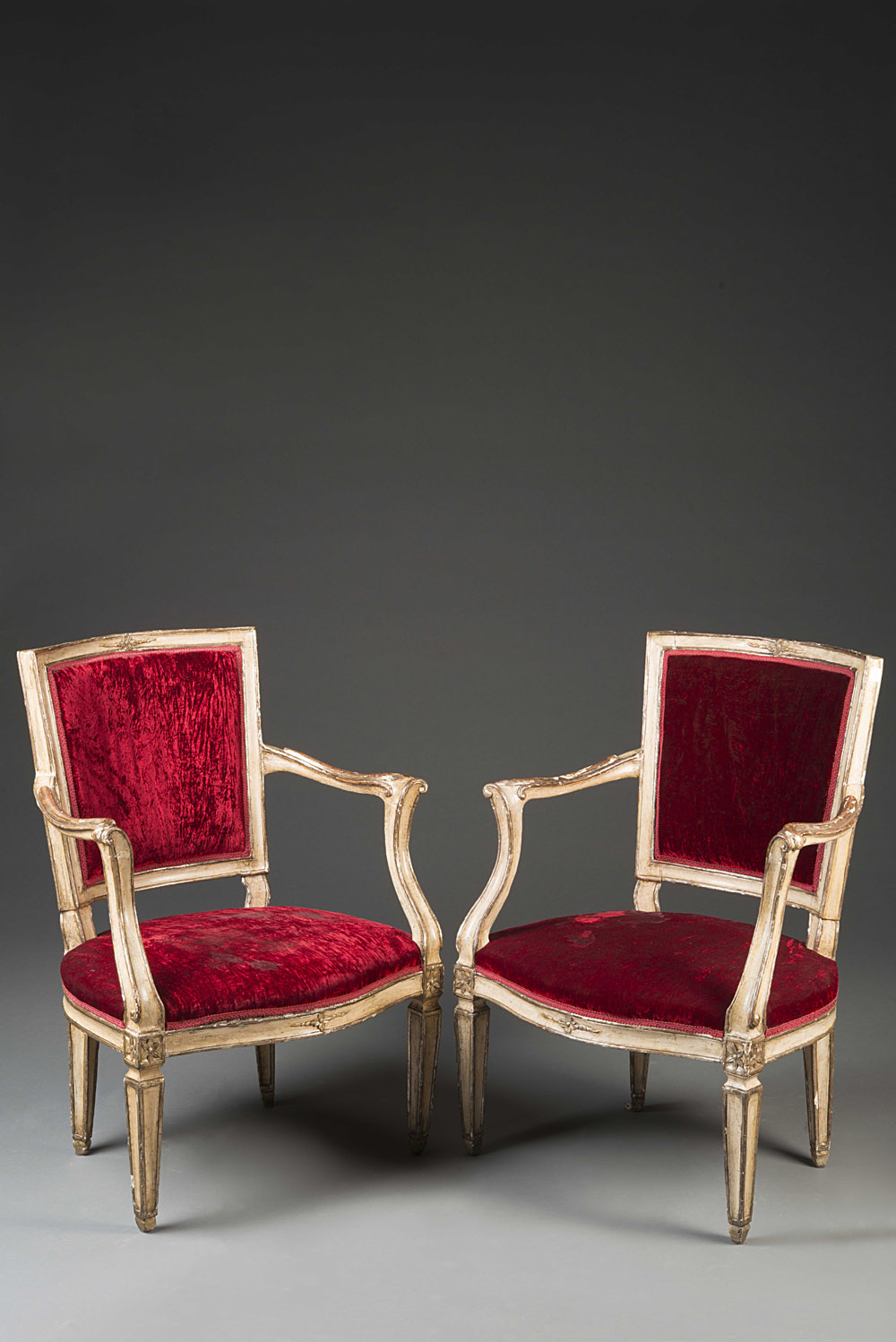 Coppia di poltrone in legno laccato e intagliato con profilo dorato, schienale squadrato sormontato da fiore. Braccioli mossi e gambe ad obelisco. Sec. XVIII (difetti) Pair of parcel-gilt lacquered and carved wooden armchairs. 18th century (defects)
