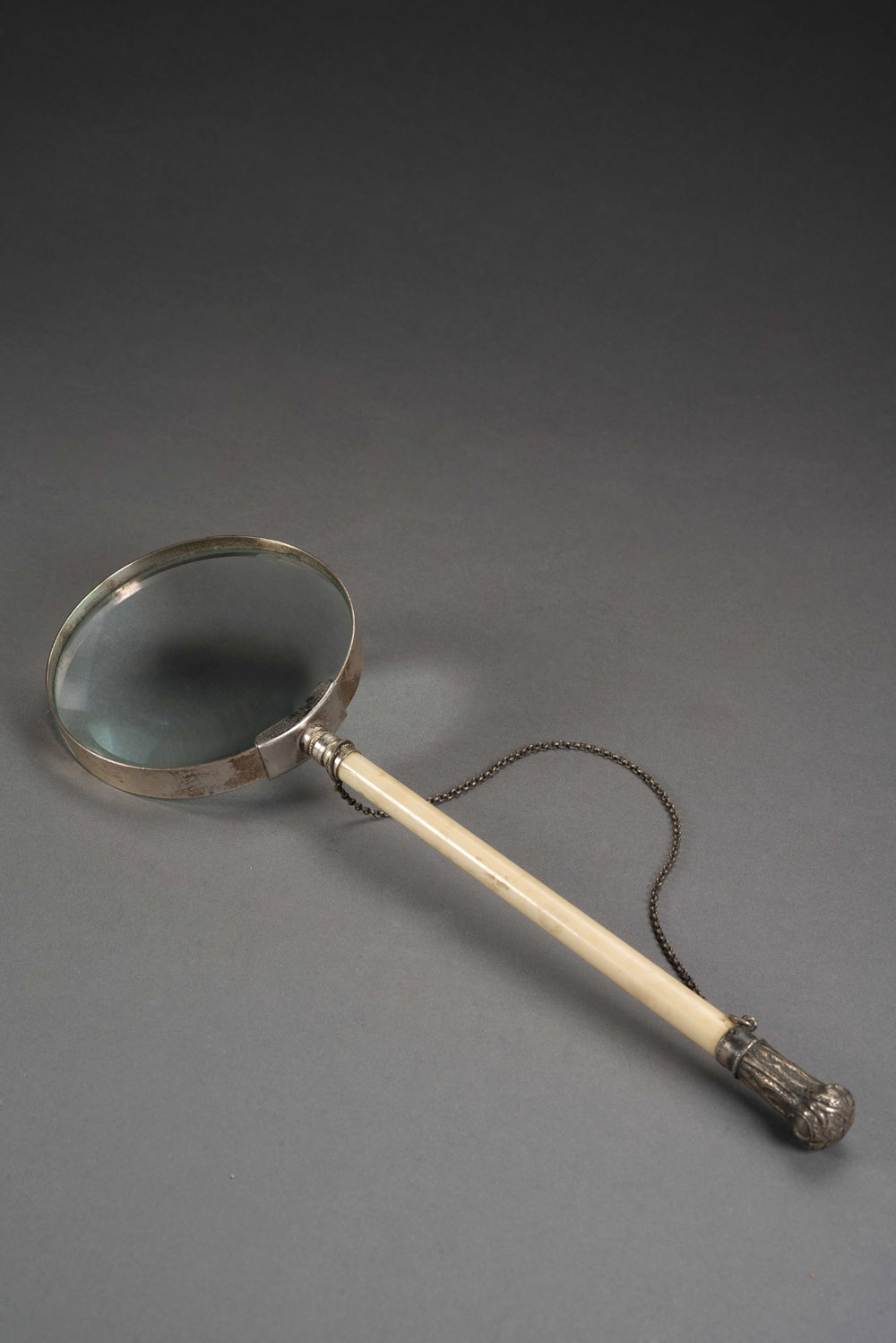 Lente di ingrandimento con manico in avorio liscio e pomello in argento...