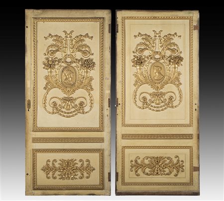Giuseppe Maria Bonzanigo (Asti 6 settembre 1745-Torino 18 dicembre 1820) Coppia di porte in legno intagliato, laccato e dorato. Pannello superiore riccamente intagliato con girali, festoni e corone, dai quali dipartono due cornucopie ricche di fiori e foglie d'acanto che incorniciano un medaglione ovale contenente un profilo di nobildonna e l'altra un profilo di condottiero. Parte inferiore intagliata anch' essa da girali di foglie. Entrambe entro cornice intagliata e dorata. Una porta è contrassegnata da un'etichetta cartacea di un vecchio inventario. (cm 257x112; cm 265x118) (difetti) La Sovrintendenza per i Beni Culturali e Paesaggistici del Piemonte n. 33 del 04.02.2014 ha dichiarato il bene d'interesse culturale. Pair of carved and lacquered gilt wood doors in carved gilt wood frames (defects)