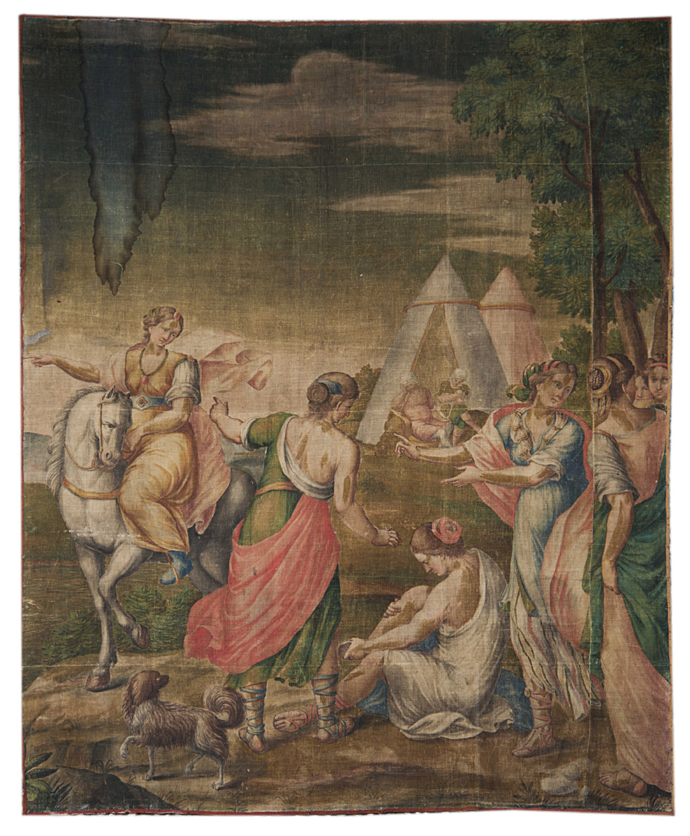 Arazzo a succo d'erba del sec. XVIII su tela dipinta raffigurante episodio di storia romana (cm. 264x216) 18th-century "succo d'erba" tapestry on painted canvas